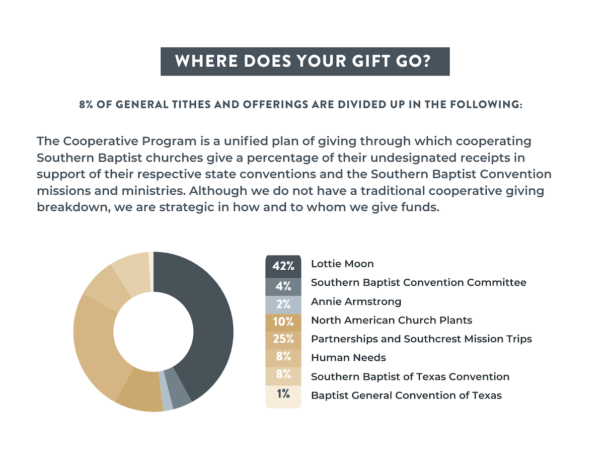 At Southcrest, we believe that giving through our finances is just another way we can worship God. As believers in Jesus Christ, we are called to trust with our whole heart in all matters; this includes our finances, which belong to Him anyway. While we don’t believe giving has anything to do with salvation, we do believe that giving our finances/wealth is an indicator of a believer’s maturity in their spiritual walk with the Lord. The Bible speaks of money over 800 times, and Jesus Himself spoke about the topic frequently. You will hear us say that the matter of giving is not an economic matter, but rather a heart matter. For those of you that are faithfully giving to Southcrest – Thank You!”